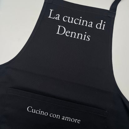 In het opmerkingenveld bij de betaling kun je noteren welke naam er op de schort mag worden gedrukt. Let op: maximaal 14 karakters. De naam zal dan in witte letters (zoals het voorbeeld op de eerste foto) worden toegevoegd aan de zin "La cucina di ...", Italiaans voor "de keuken van...".